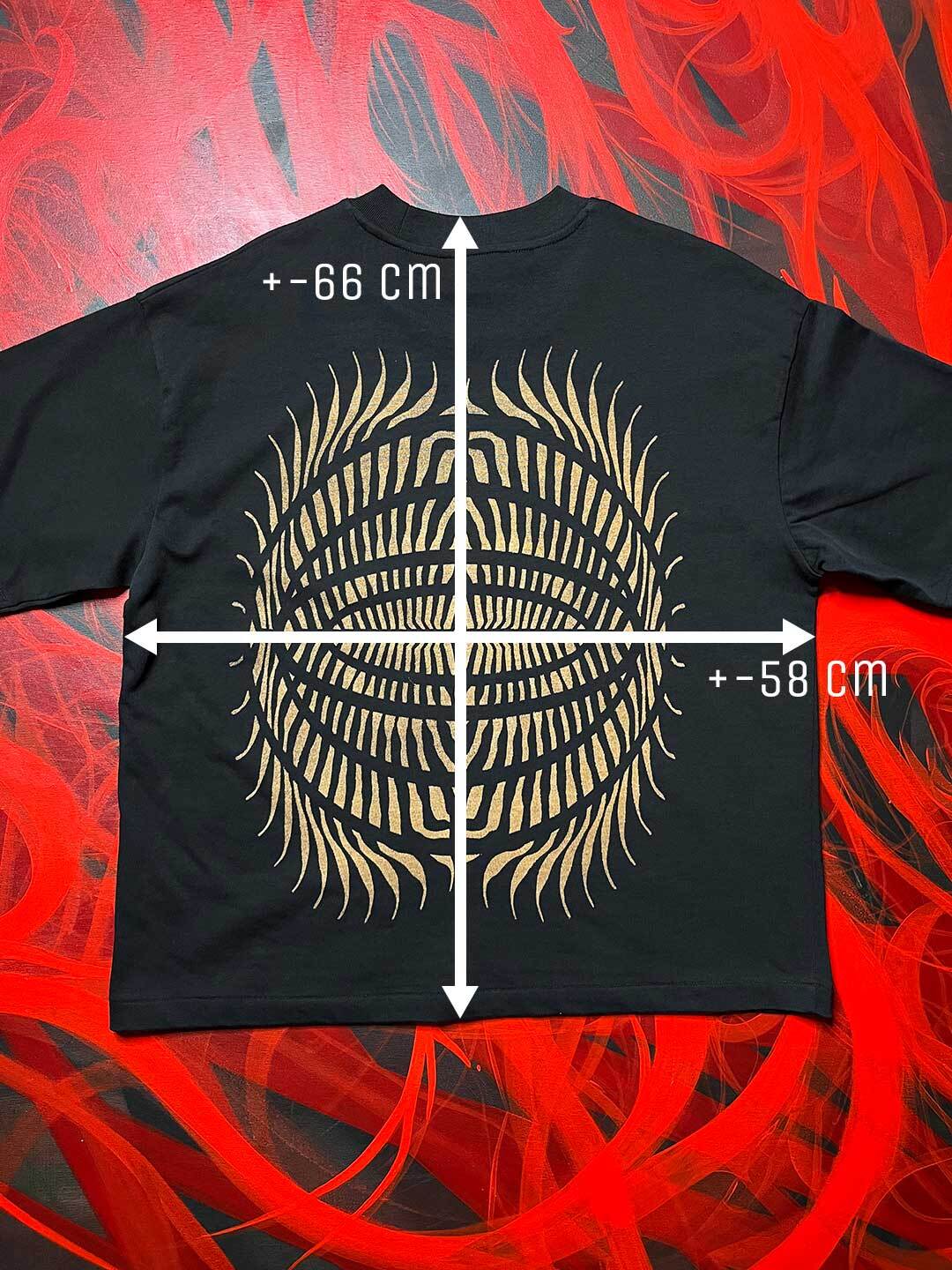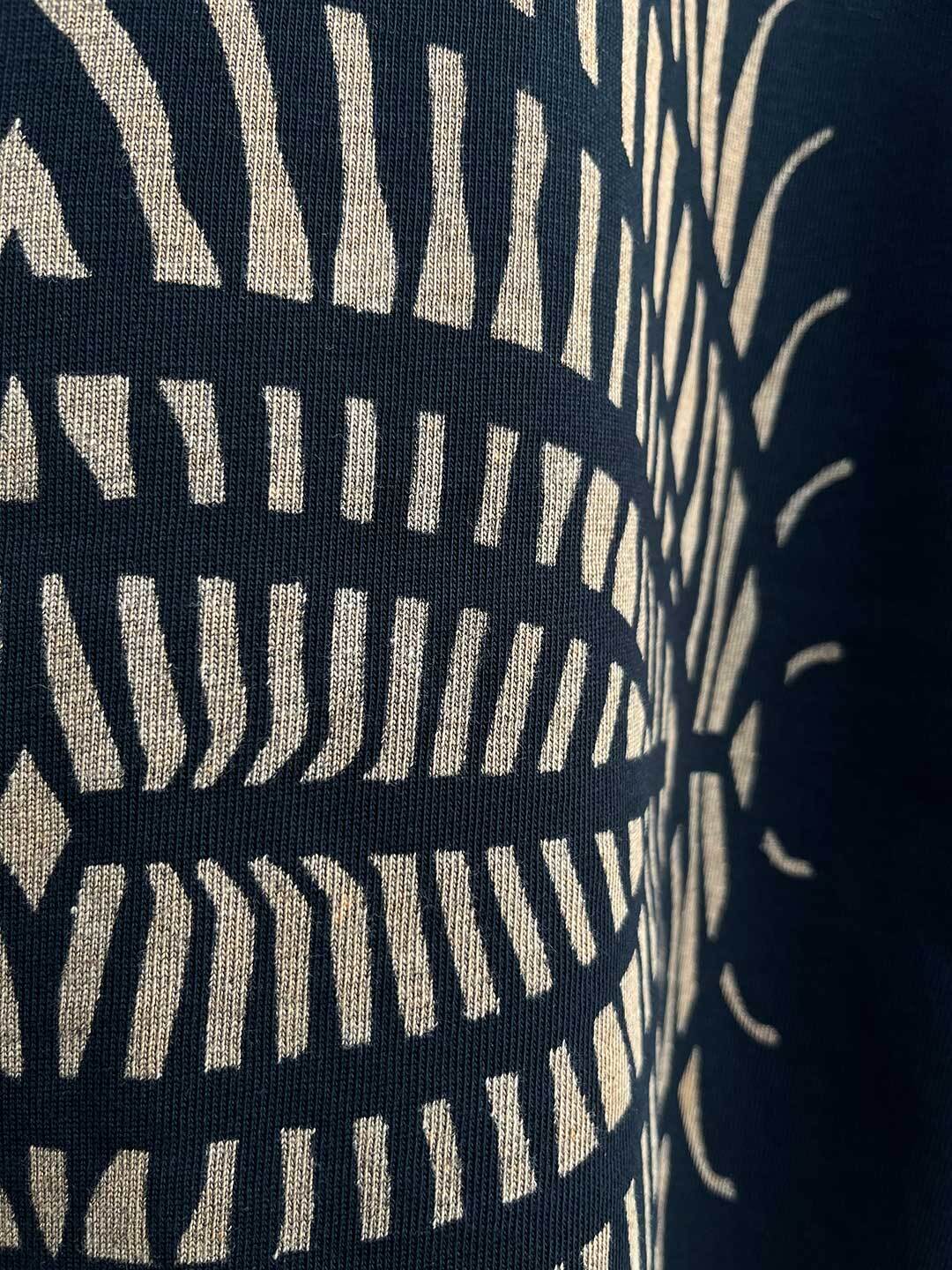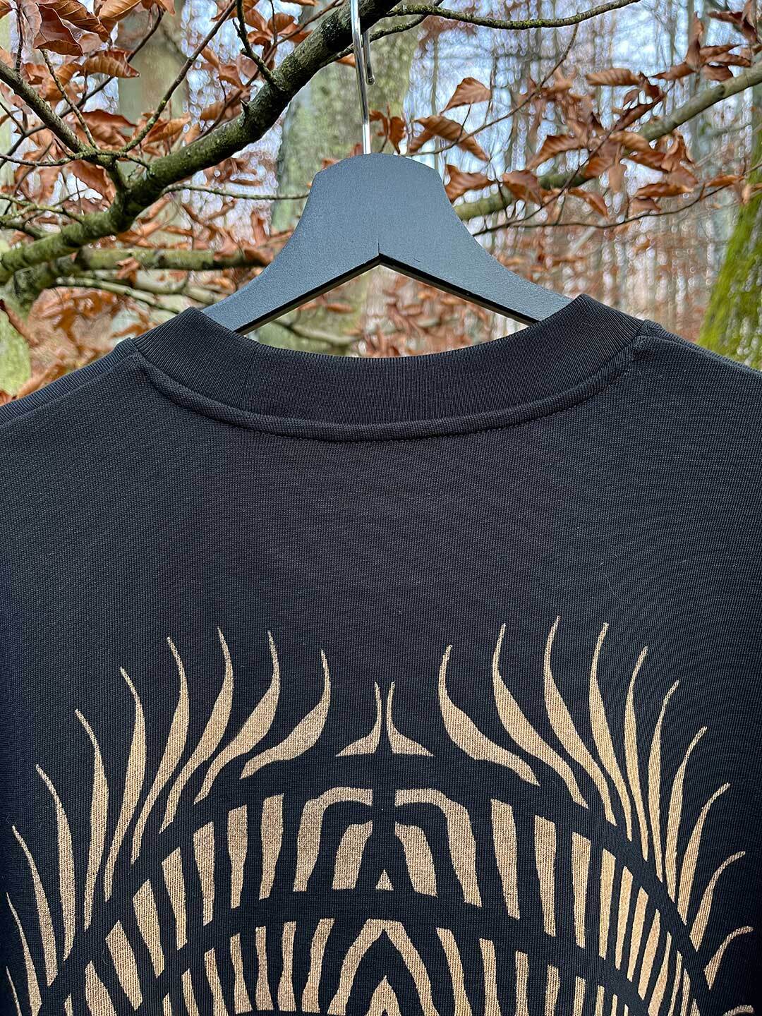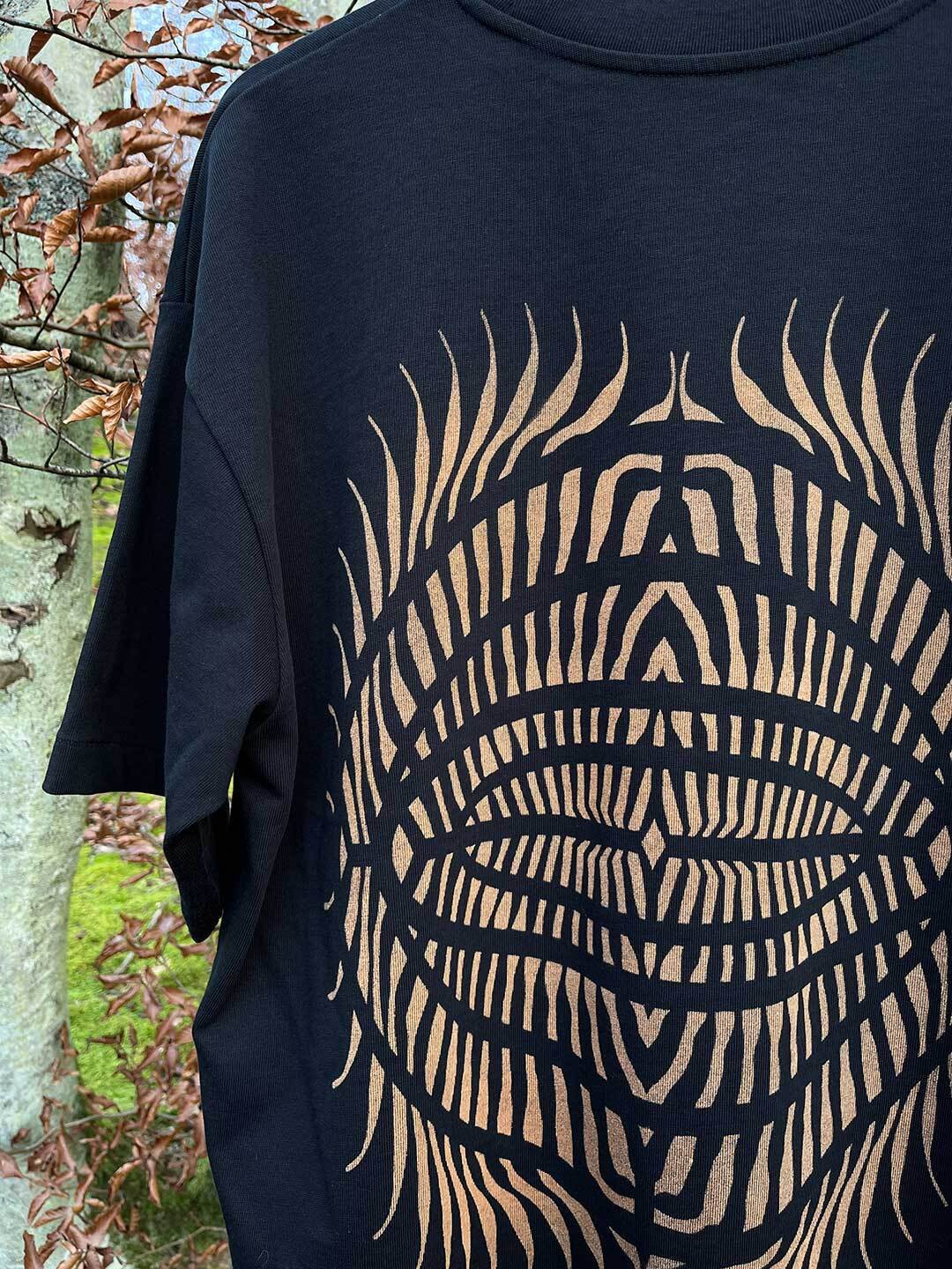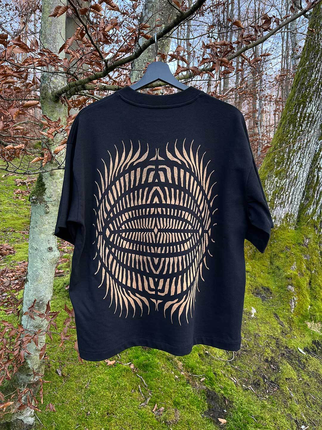 Oversized, 100% organic cotton, vegan-approved, hand-bleached pattern on the back.