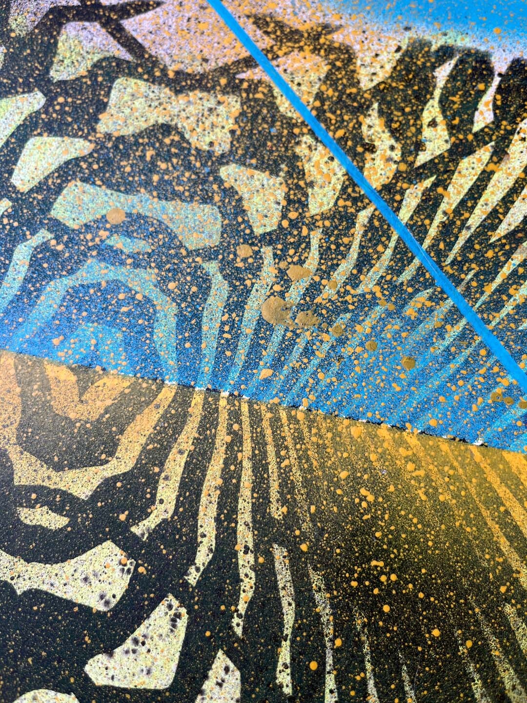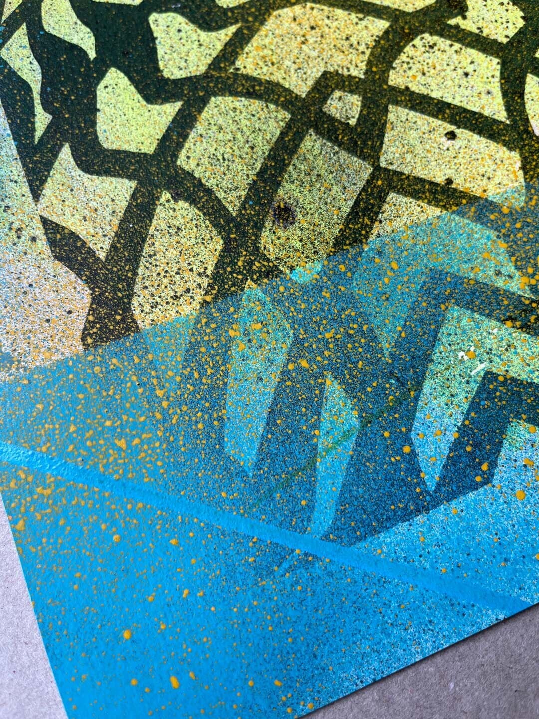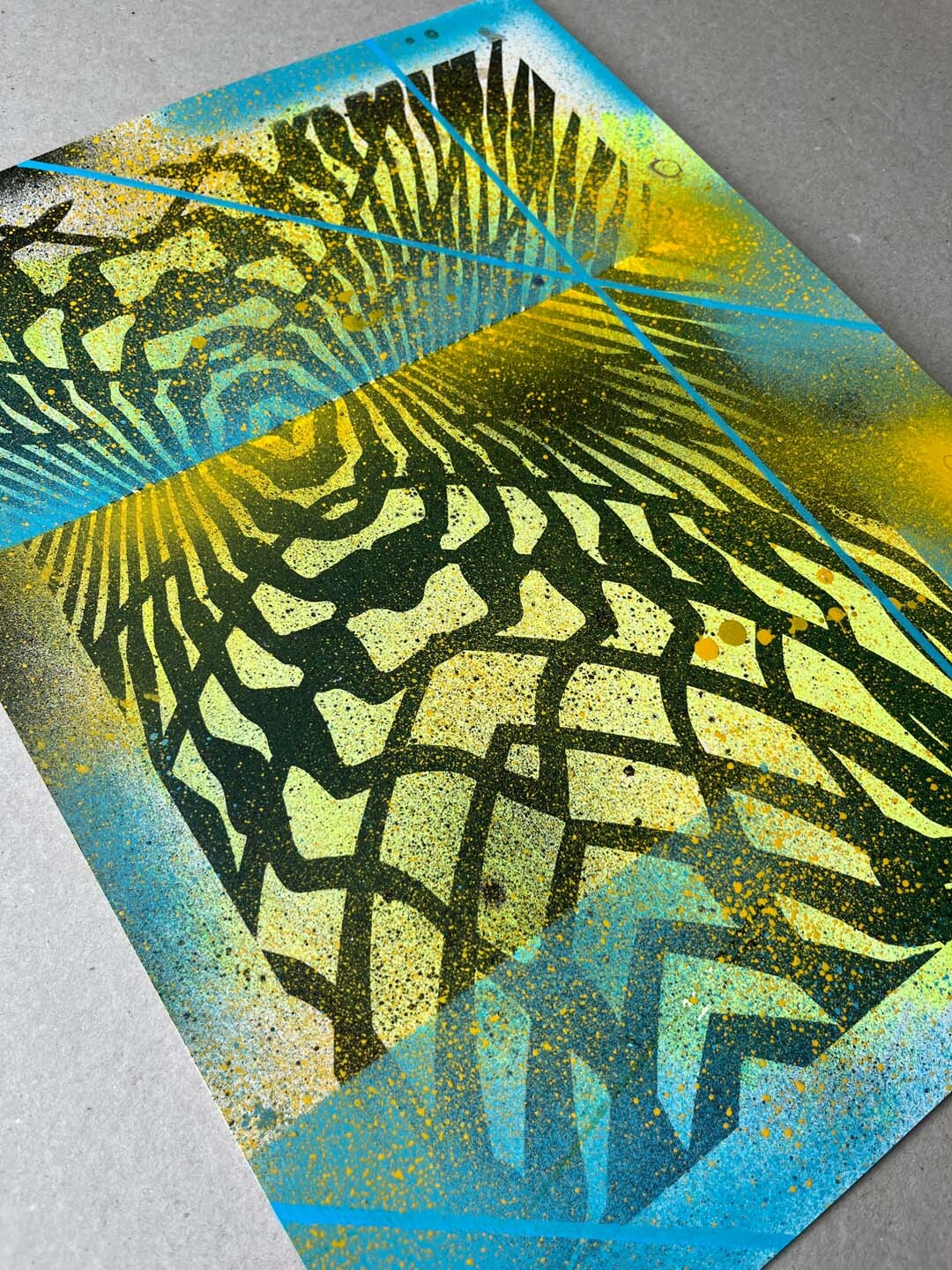 Hand made screen printing on paper, spray, acrylics, marker. Size: 30x40 cm.