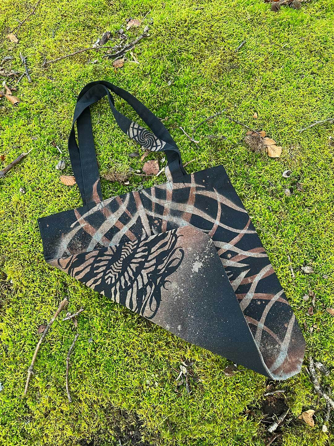 Classic canvas tote bag: 80% recycled cotton, 20% recycled polyester. Long handles reinforced with cross-stitching. Patterns on both sides are hand-bleached.
