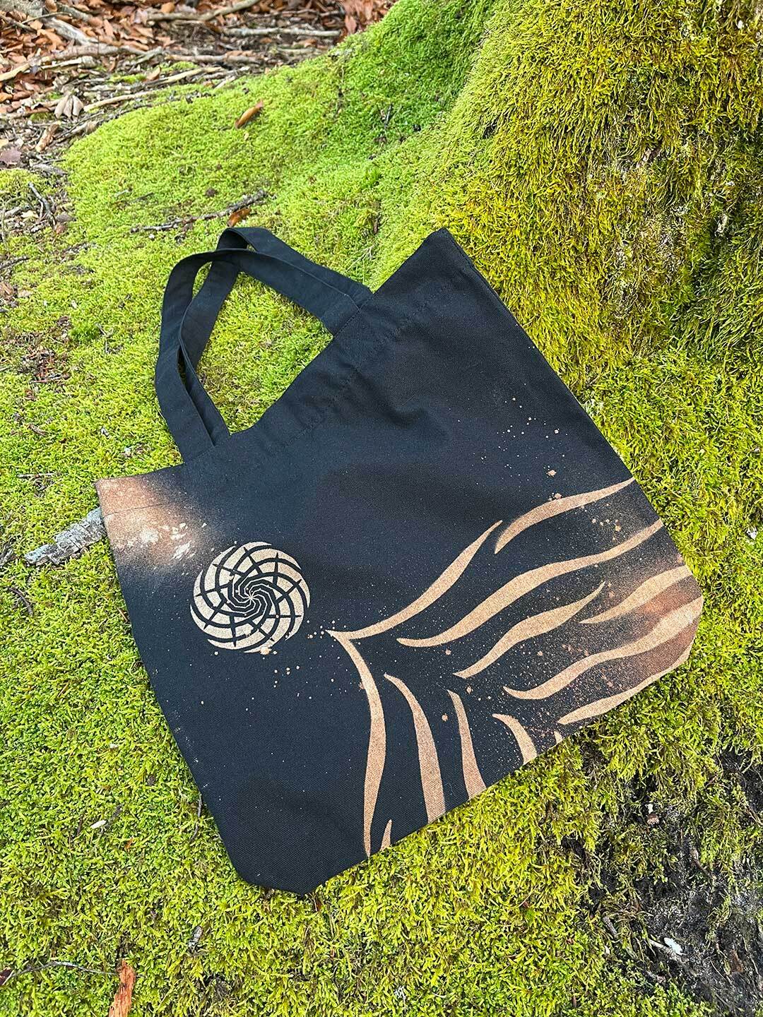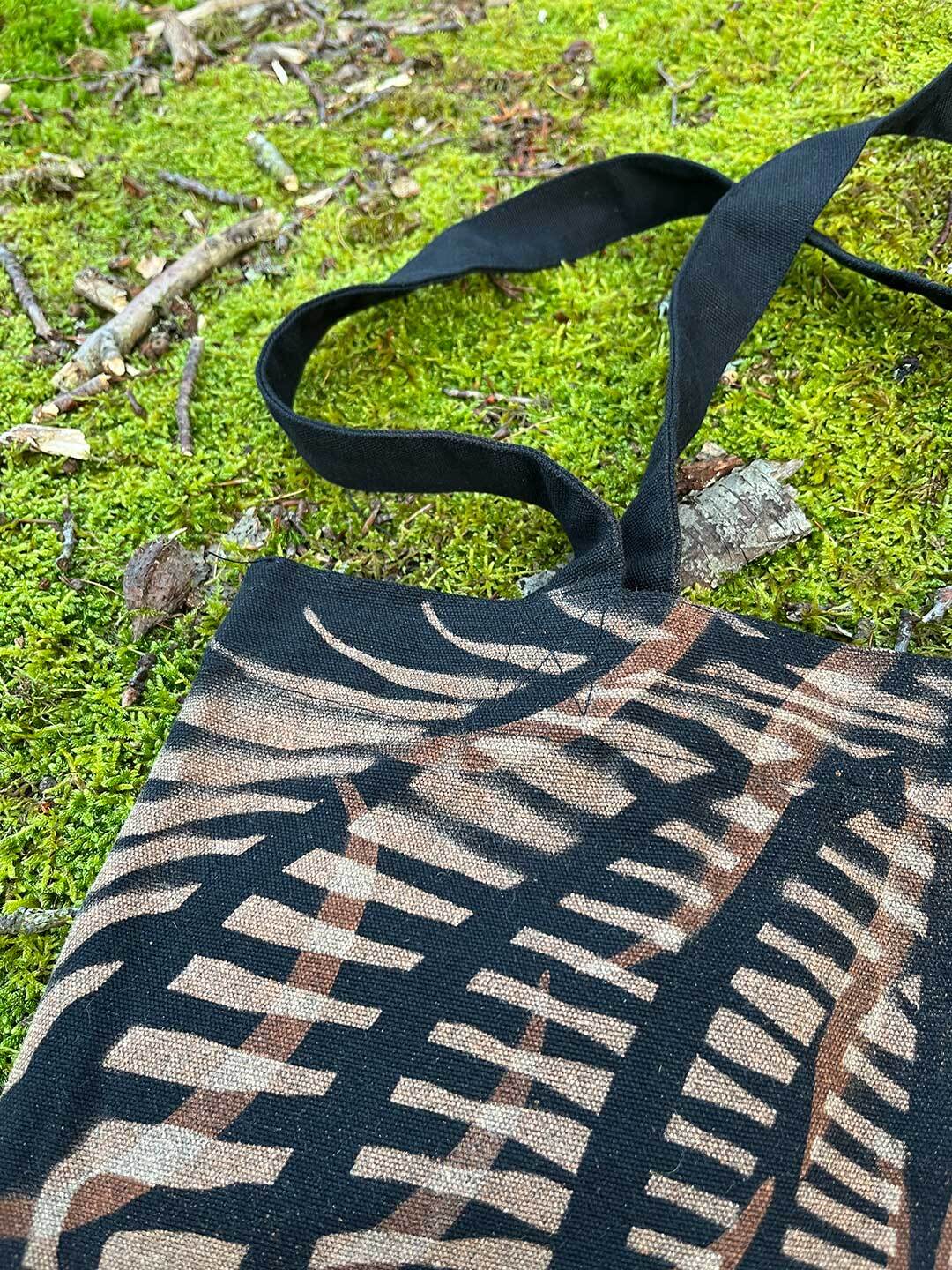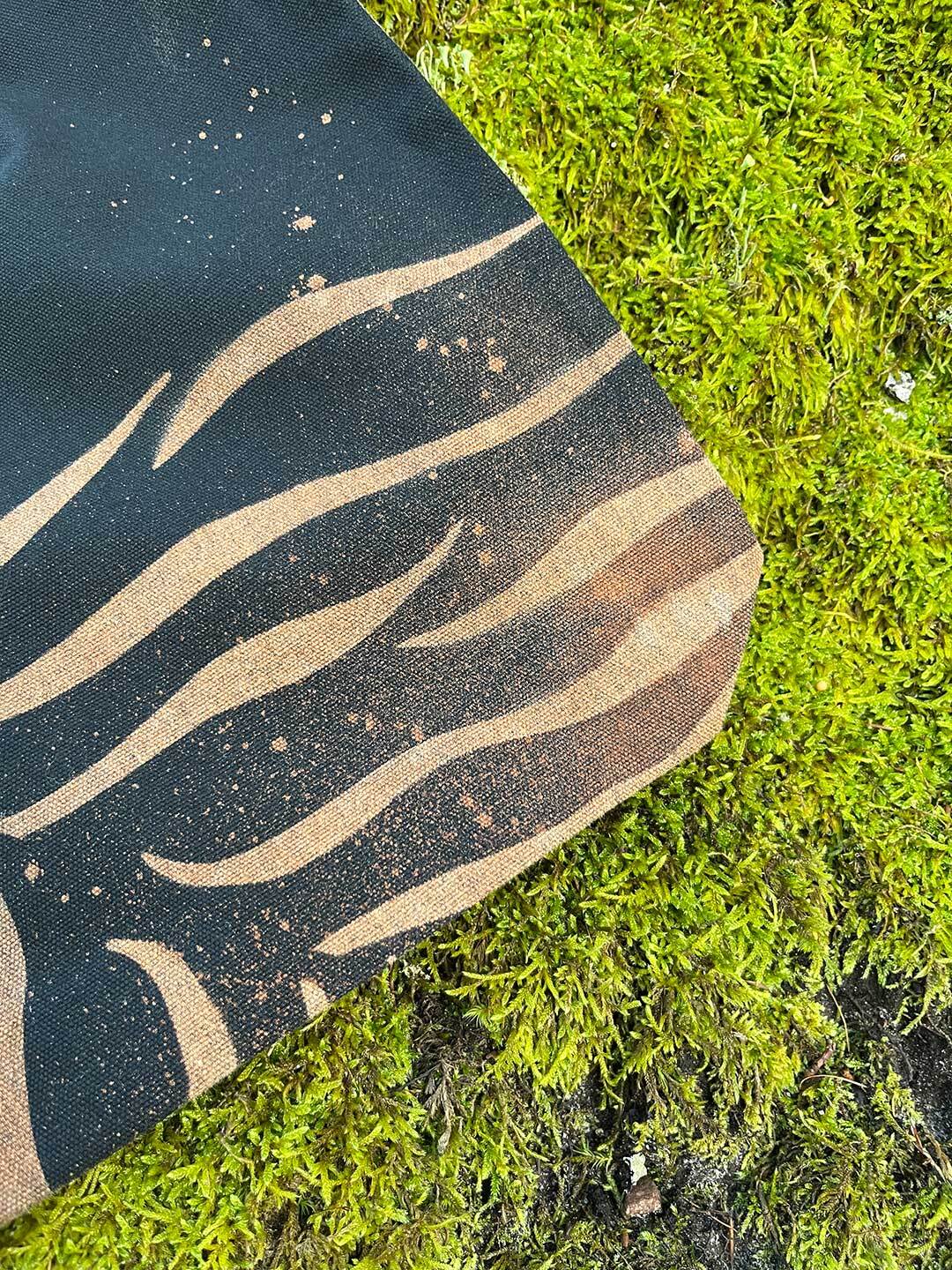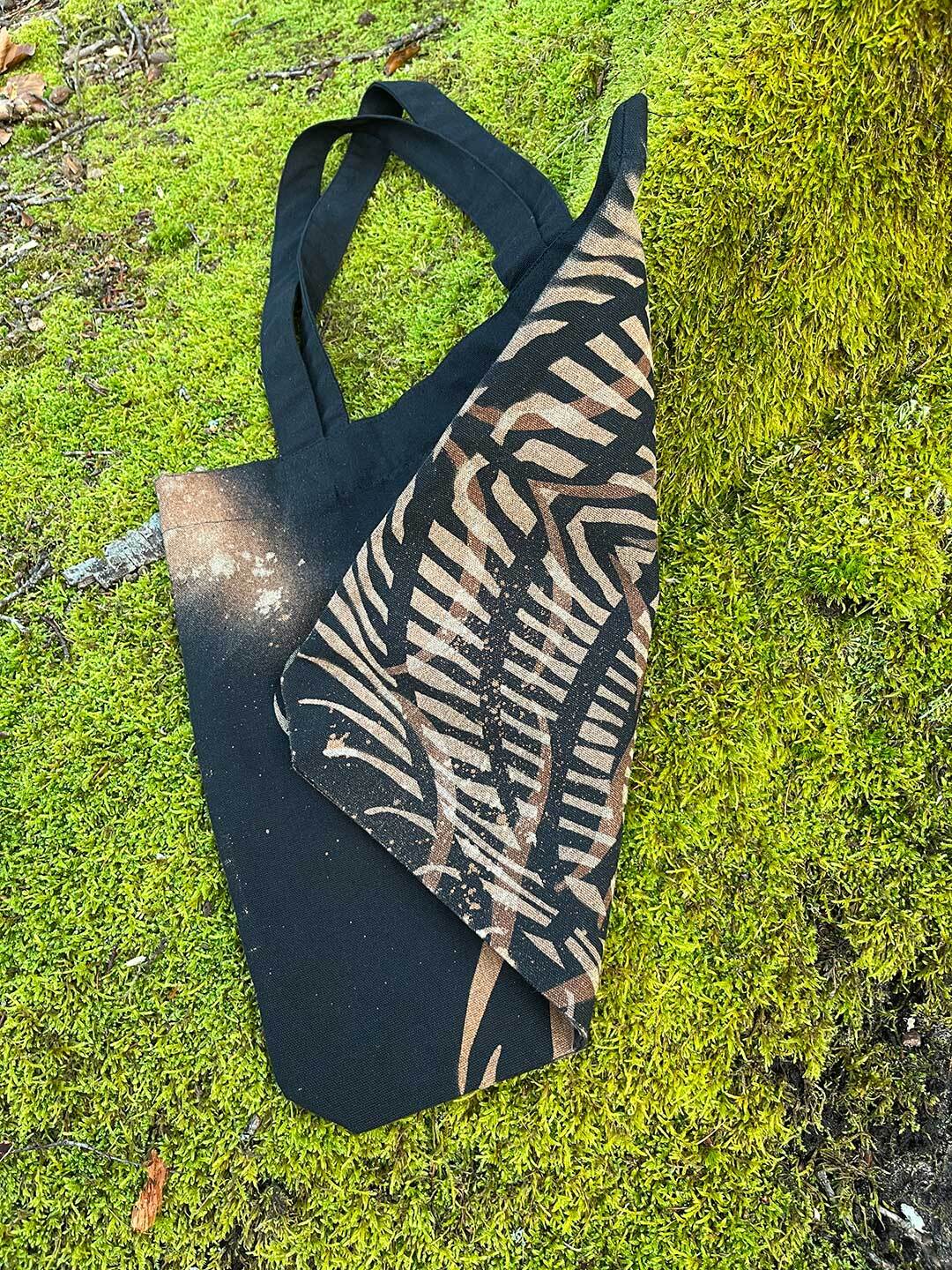 Classic canvas tote bag: 80% recycled cotton, 20% recycled polyester. Long handles reinforced with cross-stitching. Patterns on both sides are hand-bleached.