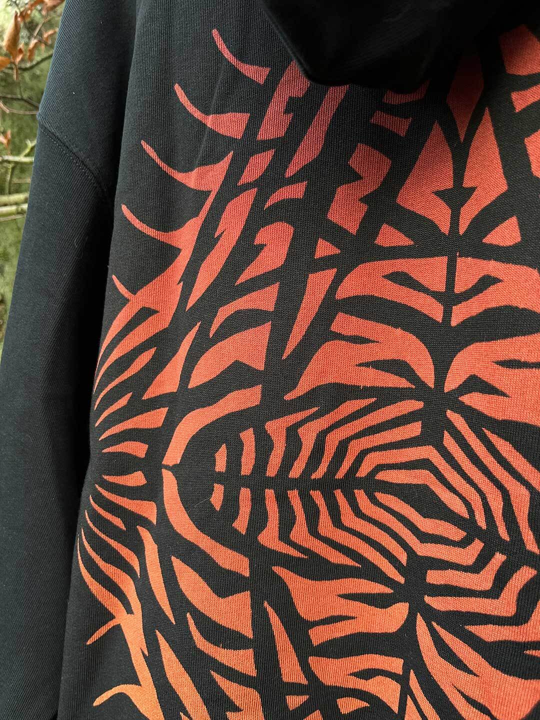 Oversized hoodie, 100% organic cotton, vegan-approved, with a hand-bleached and hand-dyed pattern on the back.