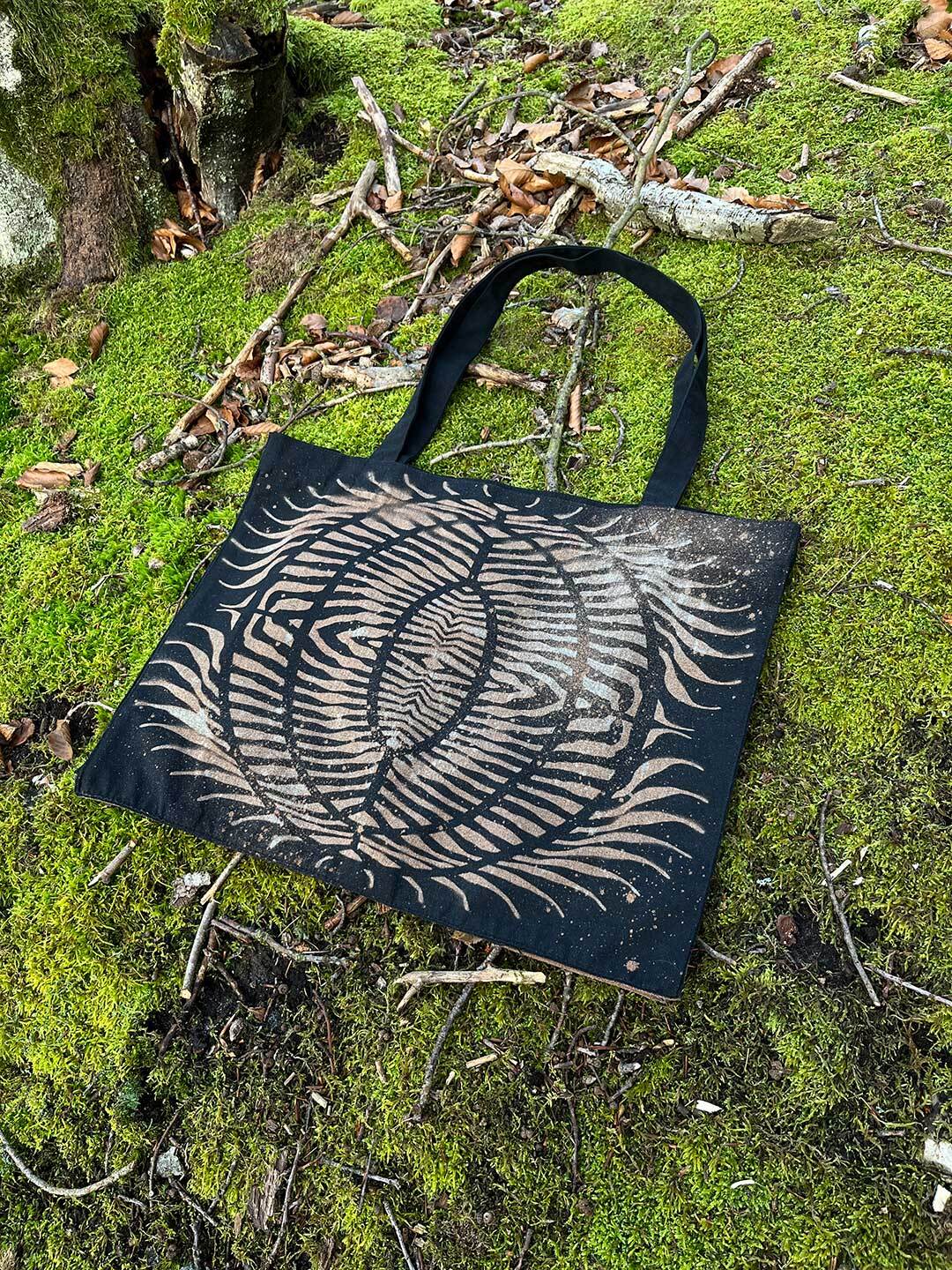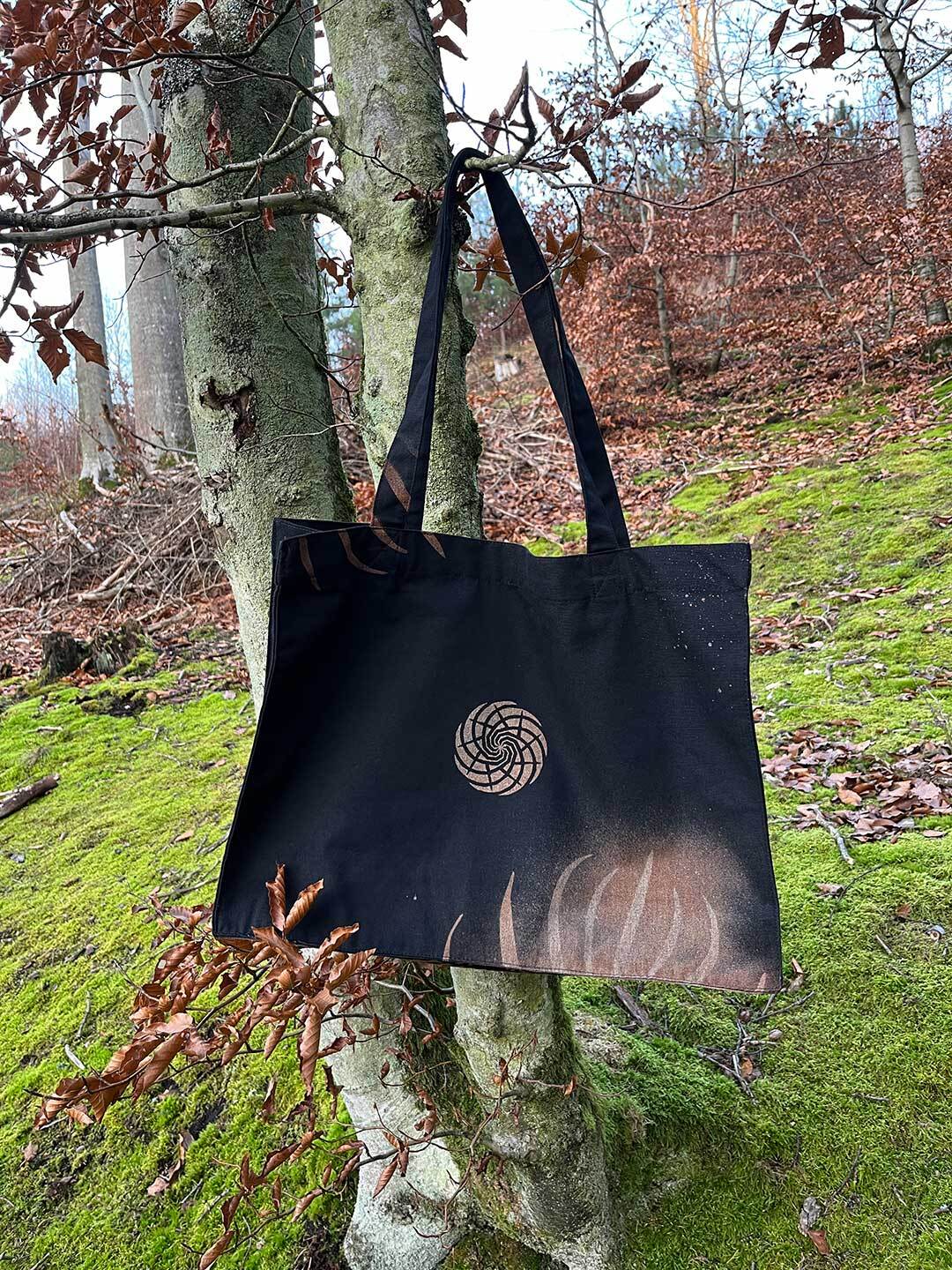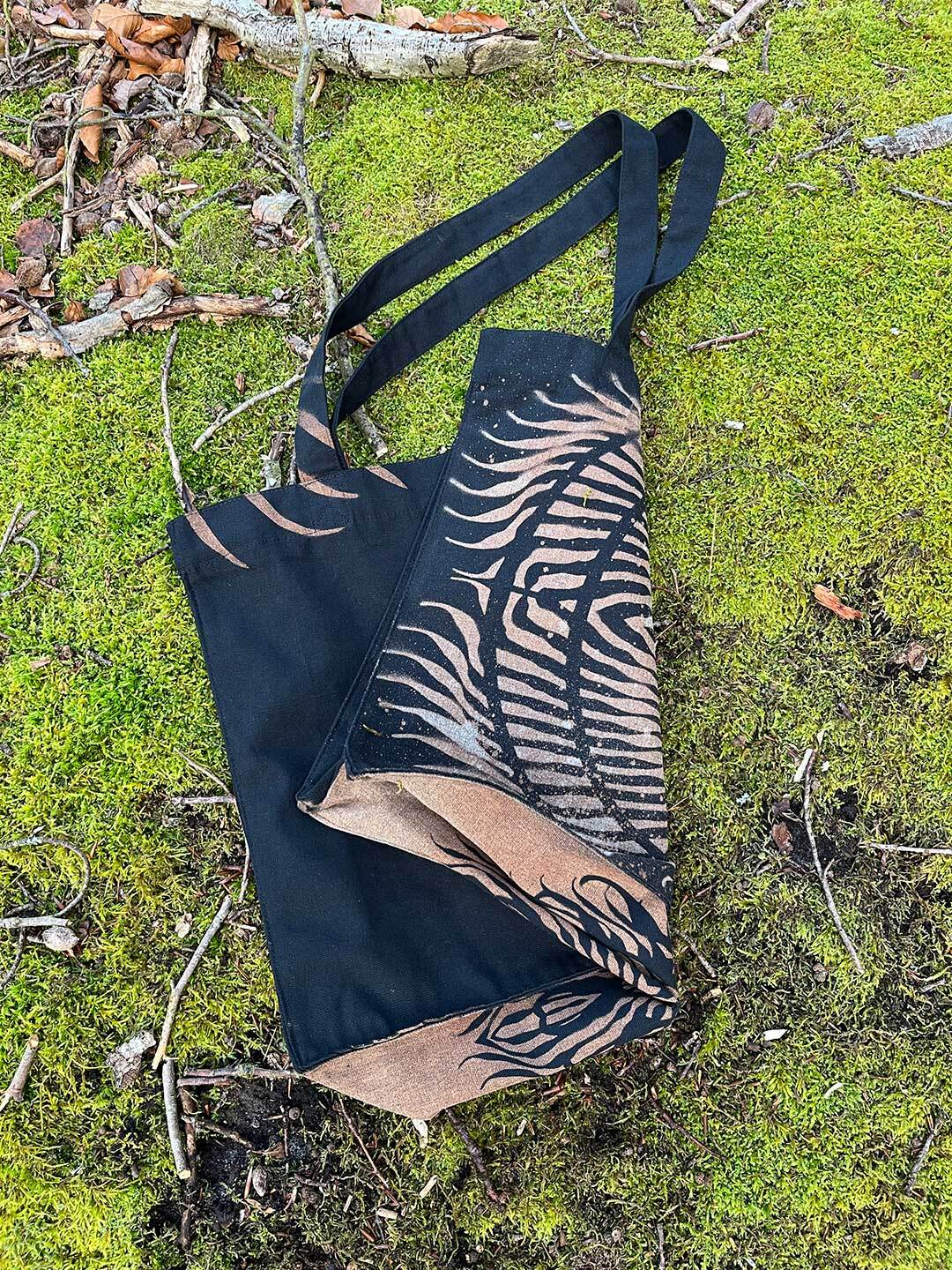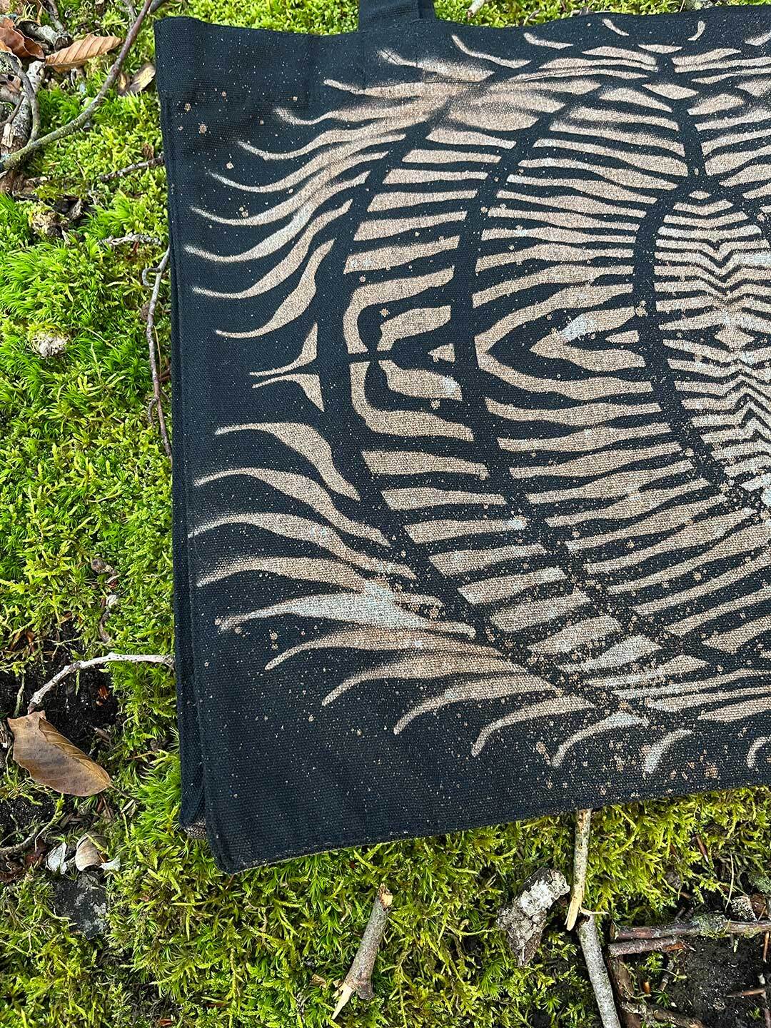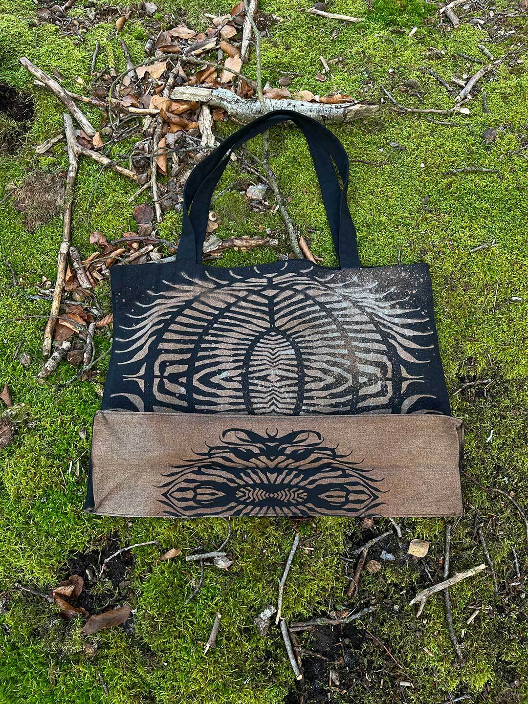 Duża torba z płótna: 80% bawełna z recyklingu, 20% poliester z recyklingu. Długie uchwyty wzmocnione krzyżowym przeszyciem. Wzory po obu stronach ręcznie wybielane.