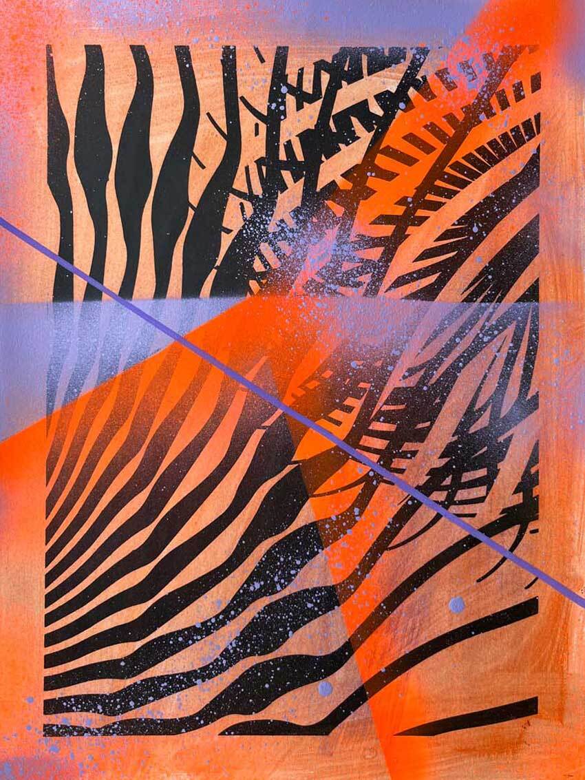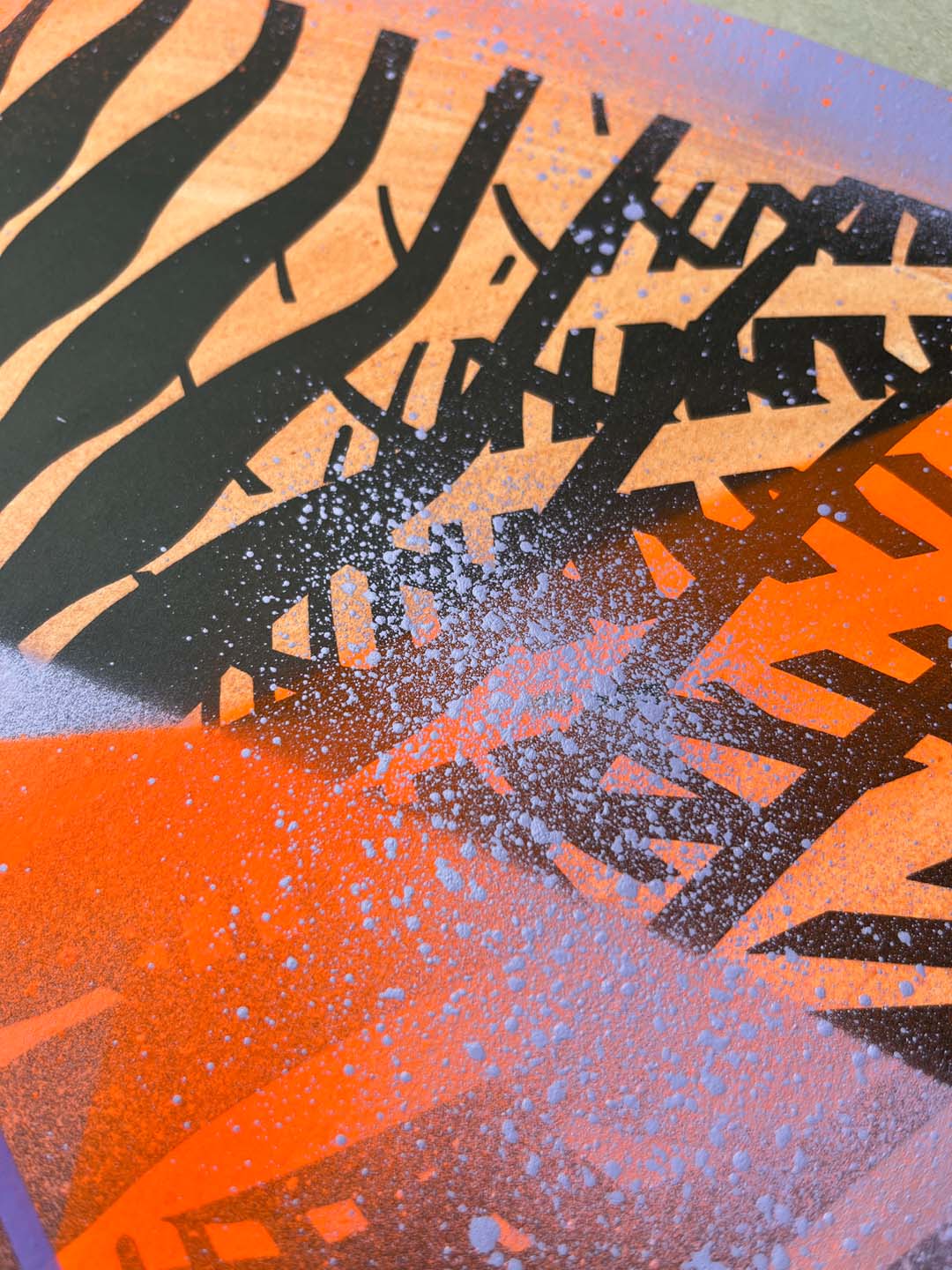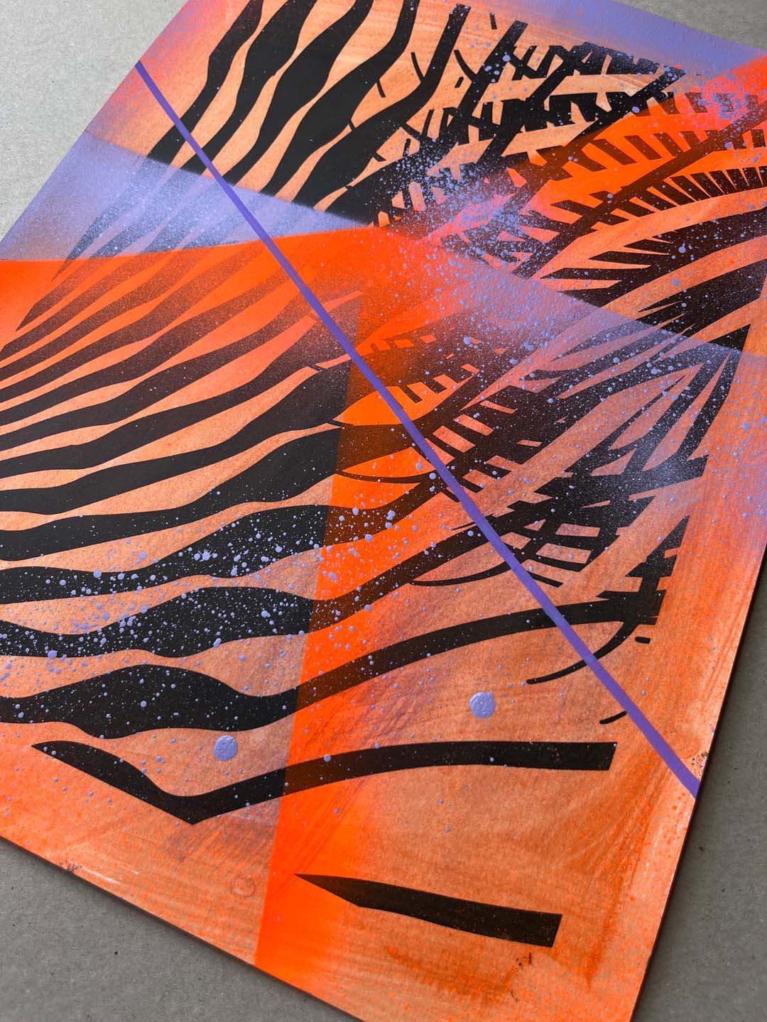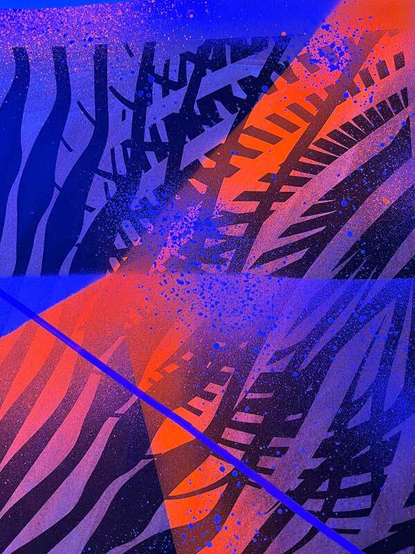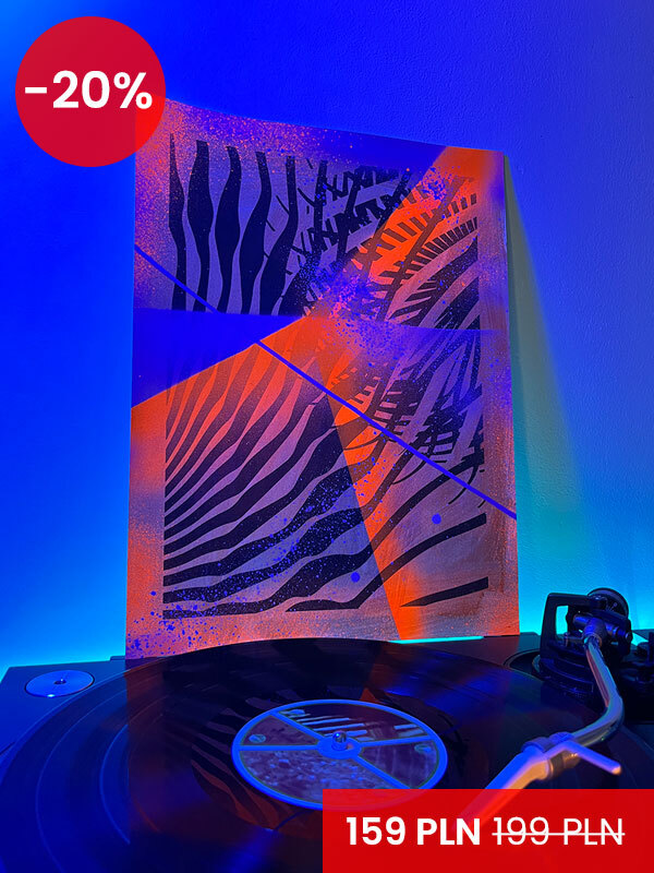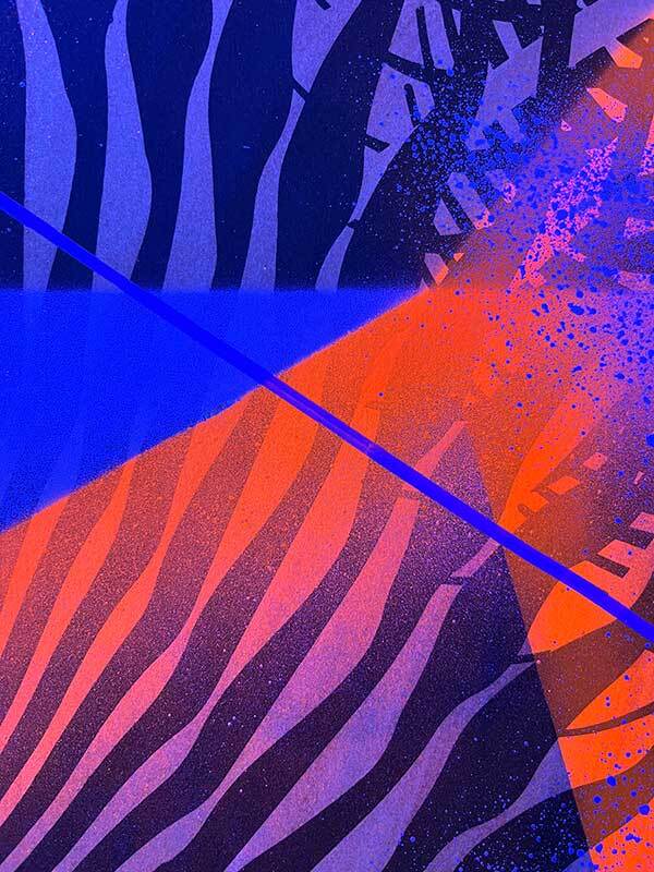 Sitodruk, akryl, spray fluo, marker. Wymiary: 30x40 cm.