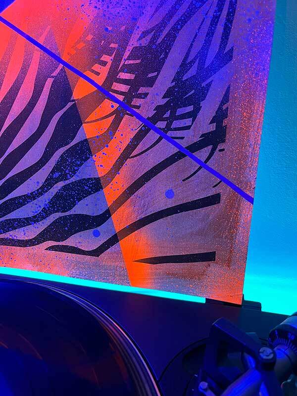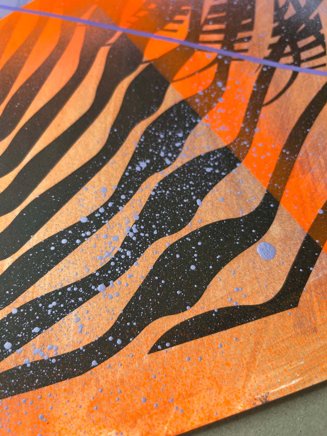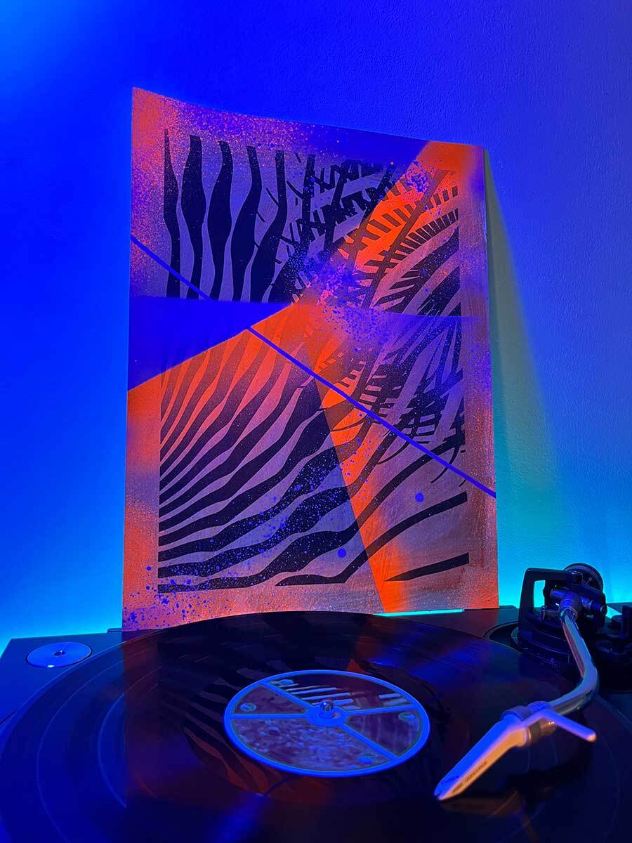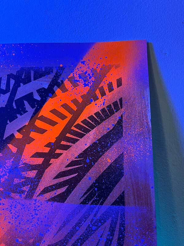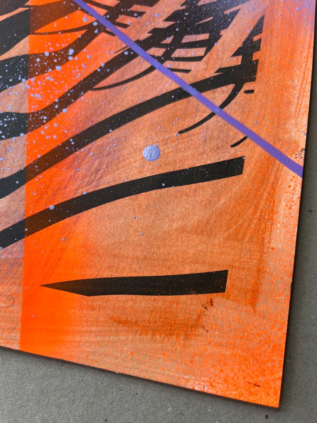 Sitodruk, akryl, spray fluo, marker. Wymiary: 30x40 cm.