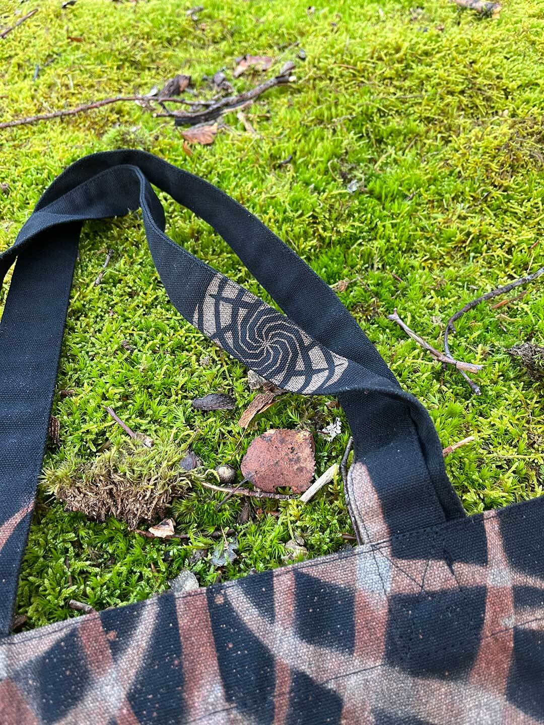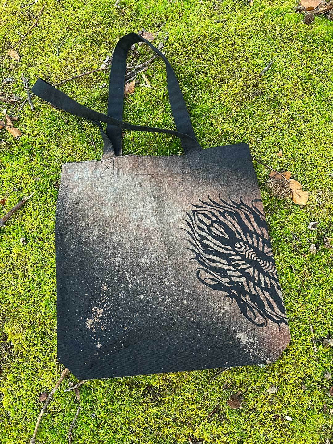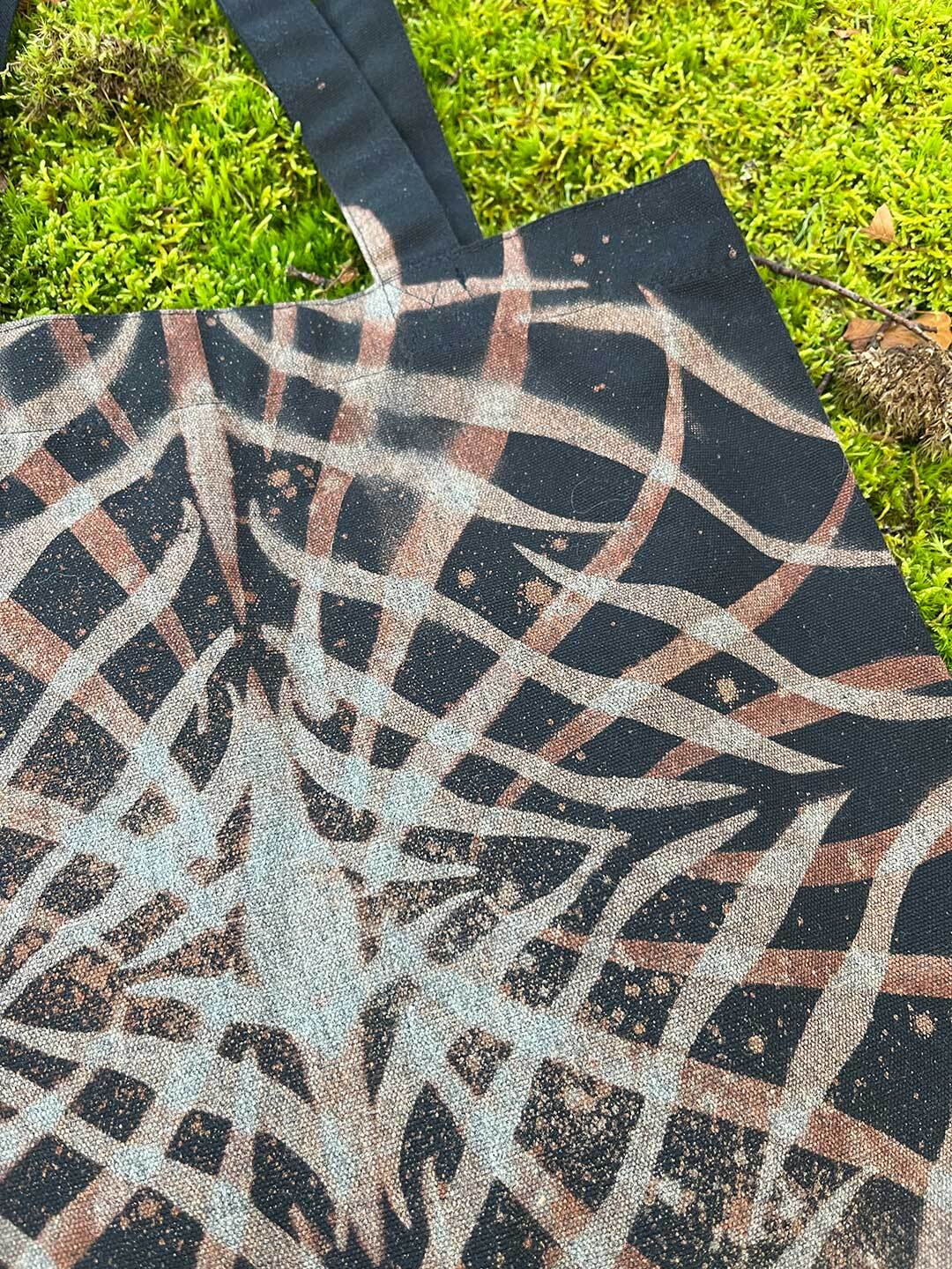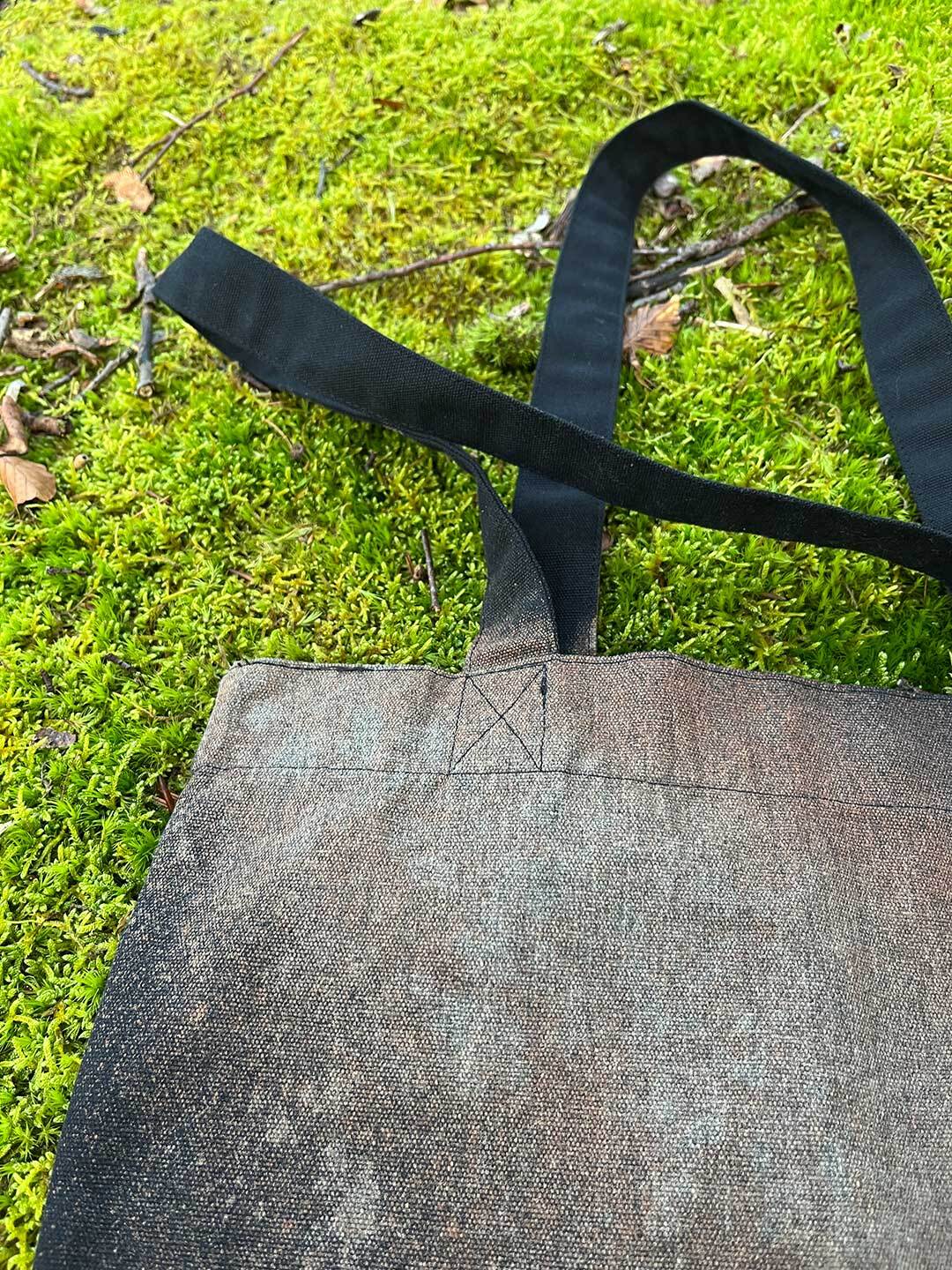 Klasyczna torba płócienna tote bag: 80% bawełna z recyklingu, 20% poliester z recyklingu. Długie uchwyty wzmocnione krzyżowym przeszyciem. Wzory po obu stronach ręcznie wybielane.